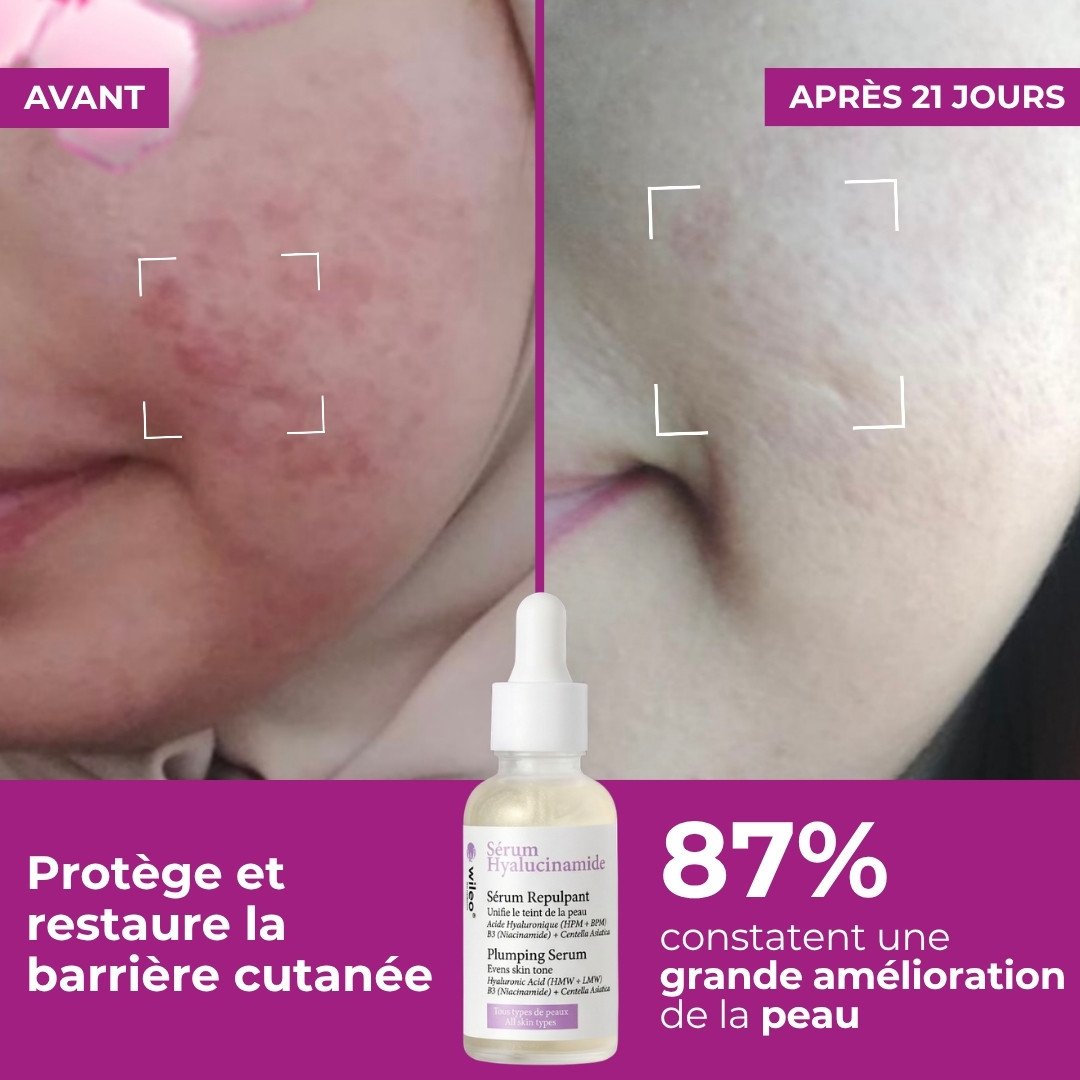Oui, le Sérum 3x1 à l'Acide Hyaluronique et Niacinamide est formulé pour convenir même aux peaux sensibles. Sa texture légère et non irritante apaise la peau sans provoquer de rougeurs.